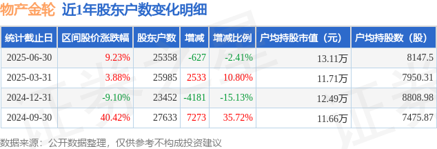 从股价来看,2025年3月31日至2025年6月30日,物产金轮区间涨幅为9.23%,在此期间股东户数减少627.0户,减幅为2.41%。